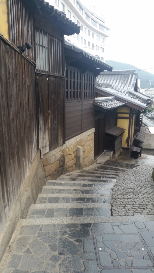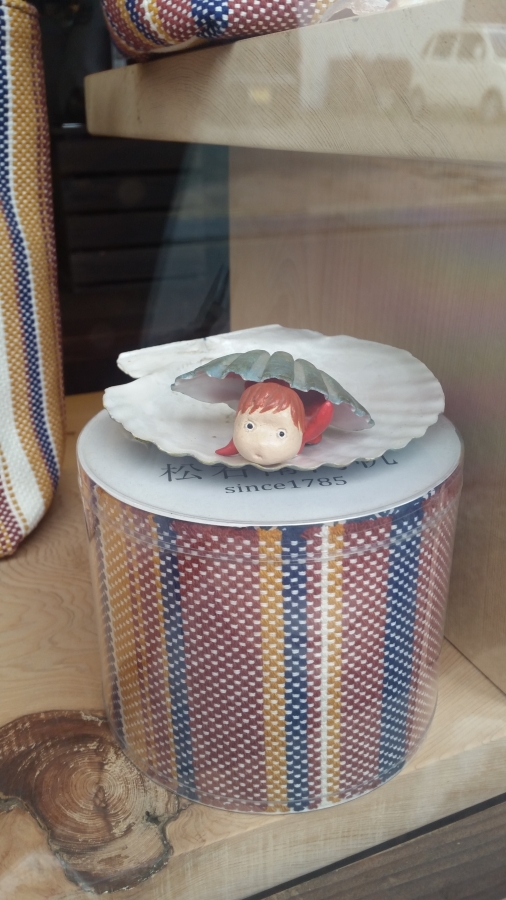 We climbed the hills. Blue and grey roof tiles glinted like fish scales. Here’s my (rainy day) shot next to the “Ponyo” artwork.
