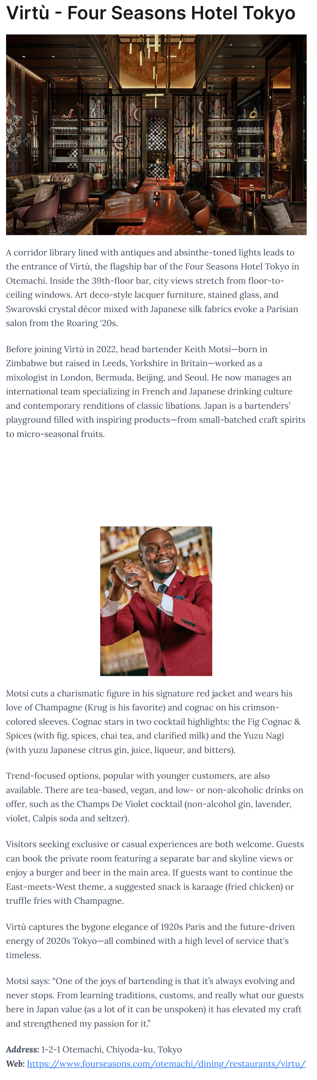 Virtù bar at the Four Seasons Hotel Tokyo in Otemachi